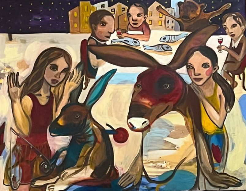Lapins, lièvres, éléphants, ours, chevaux, renards, oiseaux ou créatures mythologiques, comme le Minotaure, peuplent ses compositions. Chacun porte une charge symbolique ancienne : désir, ruse, sagesse, fertilité, vulnérabilité. Ces animaux ne sont pas des métaphores décoratives, mais des partenaires d’existence, des miroirs de nos propres contradictions.